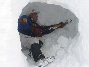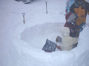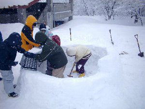 - 風下側に入口を決めて掘ります。大きさは、背を丸めて入れる大きさです。しばらく掘ったら、中心はやや高くするために天井を削ります。(このとき、積み上げた大きさと比べて掘りすぎないように注意しましょう。)