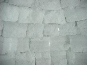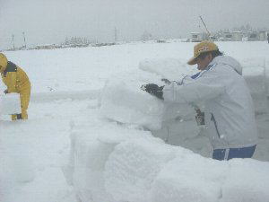 - ブロックを切り出す場所をみんなで踏み固め、スノーソウでブロックを切り出し、協力して運びます。あまり大きなブロックを切り出すと運ぶのに大変です。