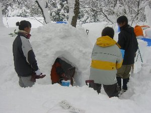 宿泊する場合は、出入口はなるべく小さく作ります。イグルー泊をする場合は、ブロックや布、ソリなどでフタをします。日中、気温が高く融け方が激しい時、雨天や気温の高い夜には宿泊は避けましょう。また、使い終わったら危険防止のため必ず崩しておきましょう。