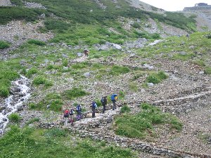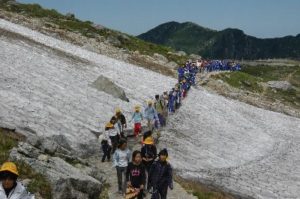 - 下山時の雪渓では、シューズが滑りやすいので特に気をつけさせ、かかとに力を入れ、踏み付けるように歩かせる。