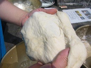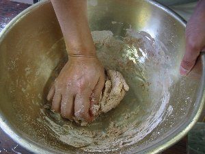 - ボールに強力粉2.5カップ、ドライイースト、砂糖、塩、マーガリン、水200ccを入れ、手につかなくなるまで、こねる。粉は約100g程度残る。これを硬さの調整用に使う。