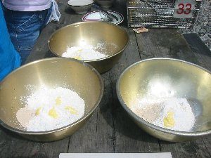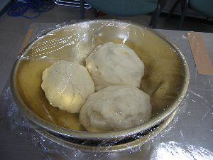 1kgの粉を3つのボール300g(2.5カップ)ずつ入れ、班で3つの生地(基本生地セット)を作る。