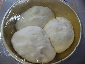 - 生地をこね終わった後、3つの生地をボールに入れてラップをかける。