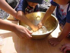 *1kgの粉全てを1つのボールでこねる方法もあるが、仕上がりにくいことと参加できる子どもの数が減る。