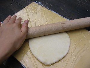 のし棒を使いながらトレイの大きさに合わ薄く広く伸ばす。丸くてもよい。。