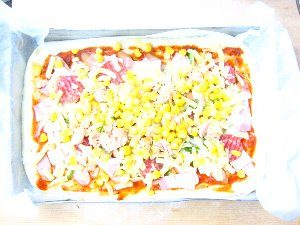 具材のトッピングが終わったら、すぐにオーブンに入れるようにする。 トッピング終わって、時間がかかると2次発酵が始まり、パンみたいな厚さになる。