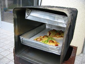 缶オーブンは、トレイが2段に入るようになっている。 *ふたを外すときやアルミのプレートを出し入れする時は軍手に革手袋をしてヤケドをしないようにする。