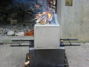 缶オーブンの上にも写真のように火を燃やす。 *上の火が強すぎると、表面が焦げるので時折出して確認する。