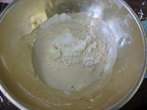 常温またはお湯(約40度)の入ったボールに湯煎し、生地が約2倍ぐらいふくれるまで発酵させる。(約20~30分)