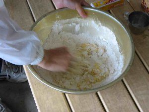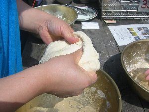 - 注意3:生地がまとまったら耳たぶくらいの硬さであること確かめる。柔らかい場合、調整用に残してある粉を入れる。