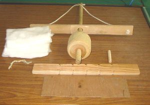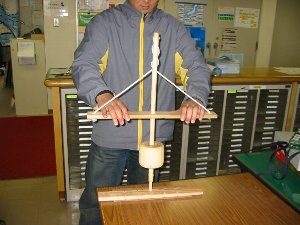 (2)火おこし器のロープを心棒に巻き付け、横バーを両手で下げると、火おこし器が回り始めます。