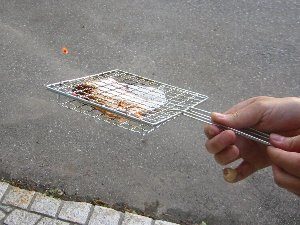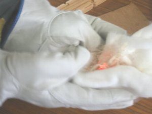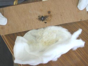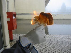 (2)革手袋をして火種の入った脱脂綿(脱脂綿は厚すぎるとよくありません)を持ち、息を吹きかけて火種を大きくしていきます。