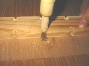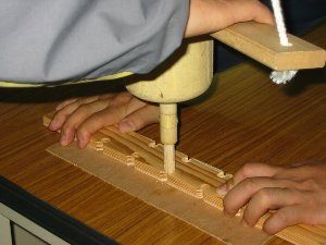(2)敷き板の上に火きり板をのせ、V字の溝の所にある火きり臼(半径1cm、深さ2mmほどのくぼみ)に火おこし器の先の火きり棒をあてます。