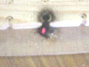 (5)V字の溝の木の粉が黒くなって、まだ続けていると、その黒い粉のかたまりから、煙が出るようになります。しっかりと煙が出ているのが確認できたら、回すのを止め、火おこし器をはずします。(ここで、息を吹きかけると黒い木粉の中に火種ができています。)