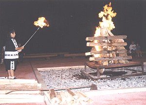 司会「火の守は、ファイヤーの周りにお集まりください。点火してください。」 (火の守は、一斉にまきに点火する。) - 歌