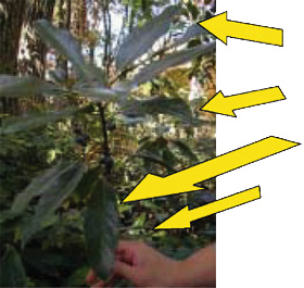 - あらかじめ植物の葉を集めておき、さわったり見たりすることで、同じ植物を森の中から探そうと意欲を持たせることができます。