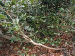 斜面に群生しているユキツバキが、どれも同じ方向に倒れているのは、雪が積もって同じ方向に倒れていくからなんだね。 雪を落としやすいように葉っぱもつるつるしているよ。