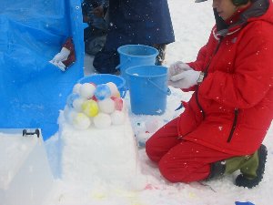雪玉に彩色をして積むシャンデリア