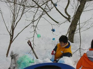 林の中にナイロンテープを張り、それに雪玉を固めて彩色を施して作る、雪の空間アート