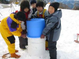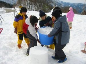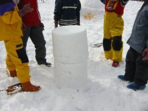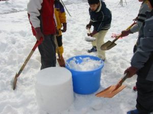 - もう1回同じように雪を詰めます。詰まったバケツをみんなでもって、先においた雪の上に2段に重なるように置きます。
