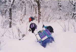 雪中行軍をして来拝キャンプ場に向かう主催事業の参加者